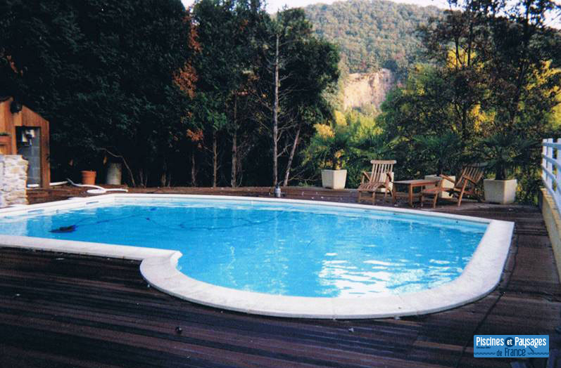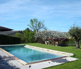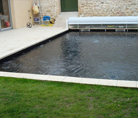 Piscine 4MX8M béton maçonnerie (1.10M à 1.60M), escalier banquette sur la largeur, revêtement PVC Armé Alkorplan 2000 sable, filtration 14 M3.H, sable de verre, Margelles Pierre Naturelle Cèdre Gray Tambourinée, volet immergé Abriblue ImBox, caillebotis bois, robot Polaris 280, pompe à chaleur Aqualux Vesuvio Inverter, terrasse bois IPE. (Les Chères - 69 )