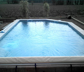 Piscine Béton Maçonnerie Pentes composées 4M X 10M – Escalier sur toute la largeur. Revêtement PVC Armé Alkorplan 2000 couleur Sable, filtration 14 M3/Heure, 2 projecteurs à led, Electrolyseur Promatic Lifeguard, robot Polaris 280, Pompe à chaleur Aqualux Vesuvio Inverter, Volet immergé APF Pool Success.